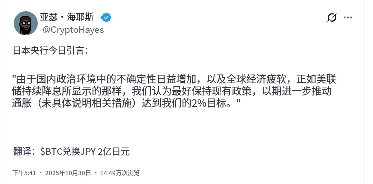 当地时间10月30日,日本银行发布了一项将载入史册的声明。他们维持2%通胀政策的承诺并非战略,而是一种投降。这不是货币交易,而是系统性崩溃。全球套利交易的基础已消失。美联储正在降息,欧洲央行将紧随其后。其影响是灾难性的且绝对的。