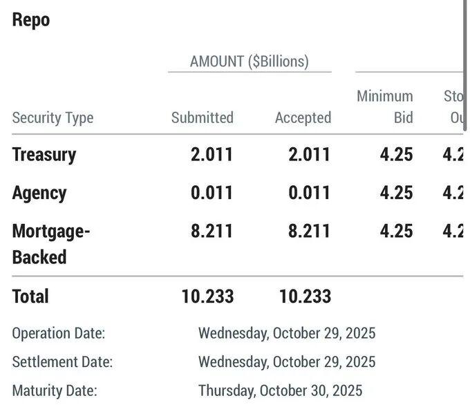 当地时间10月28日,美国银行在开盘前从美联储的储备回购(REPO)中借款84亿美元。这表明“场外现金”已所剩无几,且压力正在加剧。随后,有消息称,美国各银行从美联储回购协议中借入的流动性增加至102亿美元——所有情况都如预期发展,随着美国政府停摆时间接近35天,金融体系内的压力逐渐增大。当跨过35天这一关口,便处于银行挤兑的危险区域。
