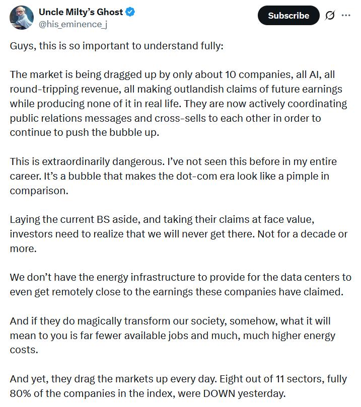 有网友指出,美国股市仅被大约10家公司带动,这些公司都是人工智能领域的公司,其收入都来自循环交易,它们都对未来收益做出了离谱的宣称,但实际上在现实生活中并未实现任何收益。这些公司现在正积极协调公共关系信息,并相互交叉销售,以继续推动这个泡沫的膨胀。这极其危险。我职业生涯中从未见过这种情况。这是一个泡沫,相比之下,互联网时代简直像一颗痘痘。