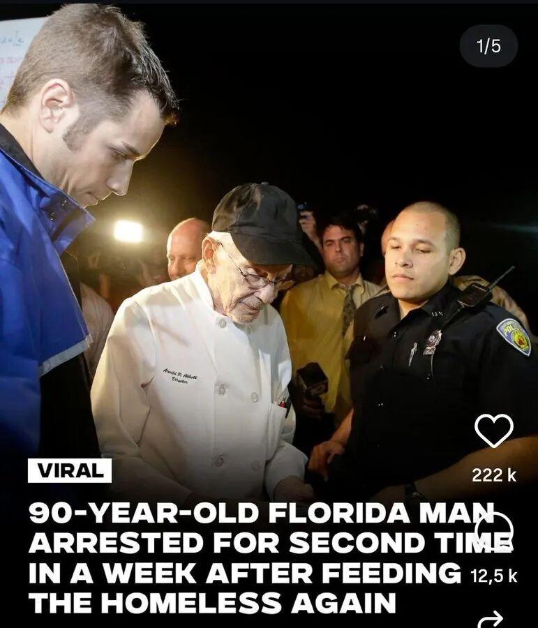 有消息称,一名90岁佛罗里达州男子因一周内第二次喂食无家可归者而被捕,此前他再次“喂食”了12.5万人。
