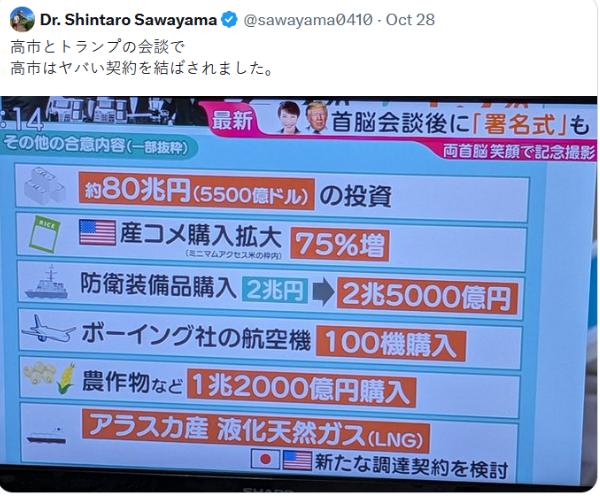 近日,特朗普与高市早苗会晤后,双方签订了一揽子协议,其中包括向美国投资5500亿美元、大米采购量增加75%、防卫装备采购提升至2.5万亿日元、波音飞机购买100架、农产品采购金额1.2万亿日元,同时再购买阿拉斯加的液化天然气等等,对于这些要求,日本方面唯命是从,做出了上百项让步。以至于有日本网友发出感慨,特朗普政府的寿命只剩三年,然而,一旦签署合同,对于日本而言,这将是一笔持续数十年的账单。这个国家完了。