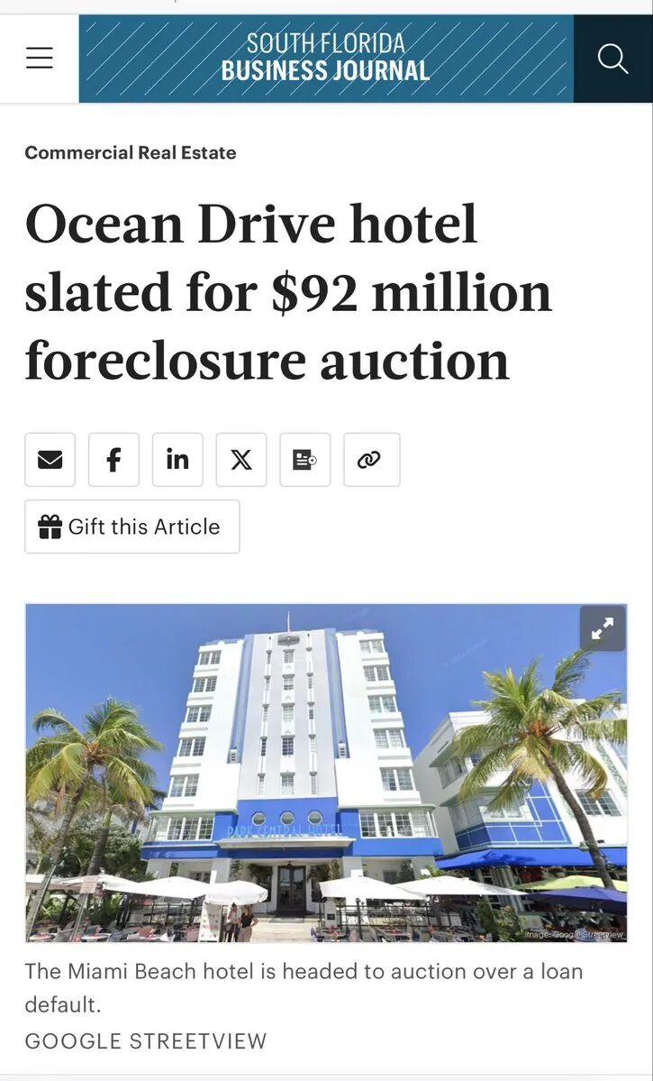 当地的Ocean Drive酒店计划以9200万美元进行止赎拍卖。