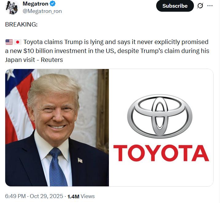 据路透社报道,丰田称特朗普在撒谎,并表示从未明确承诺在美国进行新的100亿美元投资,但特朗普在日本访问期间就这么张口就来,把丰田吓坏了。