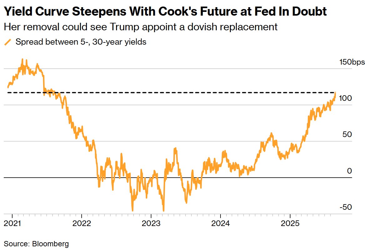 上周,在美国前总统特朗普试图罢免美联储理事库克后,对美联储独立性的担忧加剧,推动5年期和30年期美国国债收益率之差扩大至2021年以来最高水平。