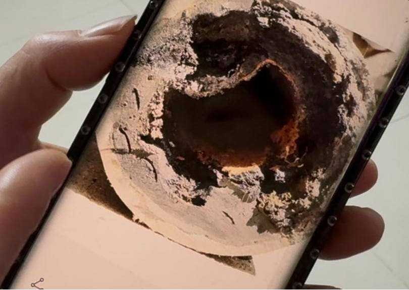翟女士手机里存有一张维修时切下的管道剖面图,从照片里可以看到,管道内壁上附着了厚厚的污物,原本如碗口大的管道,下水空间只剩下鸡蛋大的一个孔,“有的邻居家,管道堵了后,没法在家里上厕所,尤其是大便根本冲不下去,只能去小区外边的公厕。”