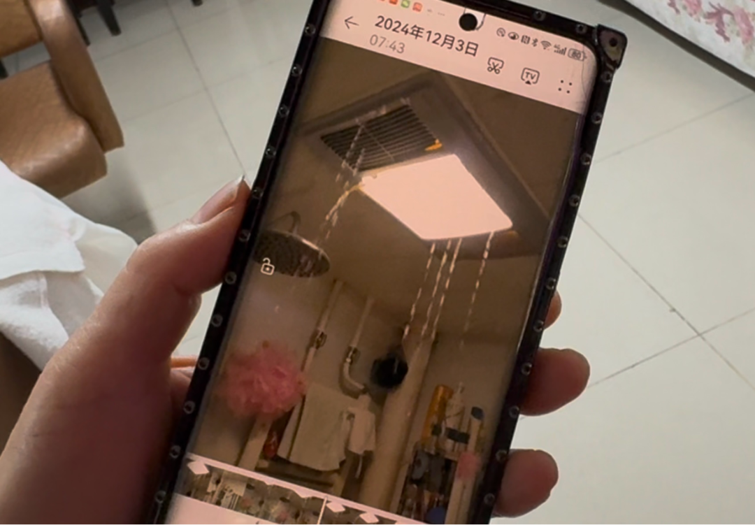 翟女士向记者出示家里卫生间漏水的图片。新京报记者 耿子叶 摄